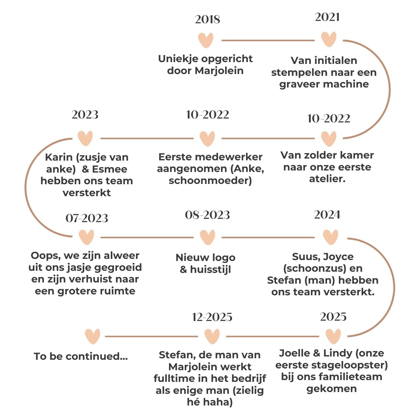 Ik (Marjolein) heb Uniekje opgericht in 2018. Inmiddels bestaan wij uit een (familie) team van 8 mensen. Samen maken wij al jouw sieraden met liefde en aandacht. Ons familie team bestaat uit: Mijzelf (Marjolein), Anke (schoonmoeder), Karin(tante), Stefan (mijn man) en Joyce(schoonzus). Naast deze familieleden hebben wij ook nog 3 super leuke dames die wij in ons familiebedrijf hebben opgenomen: Esmee, Susanne & Joelle.