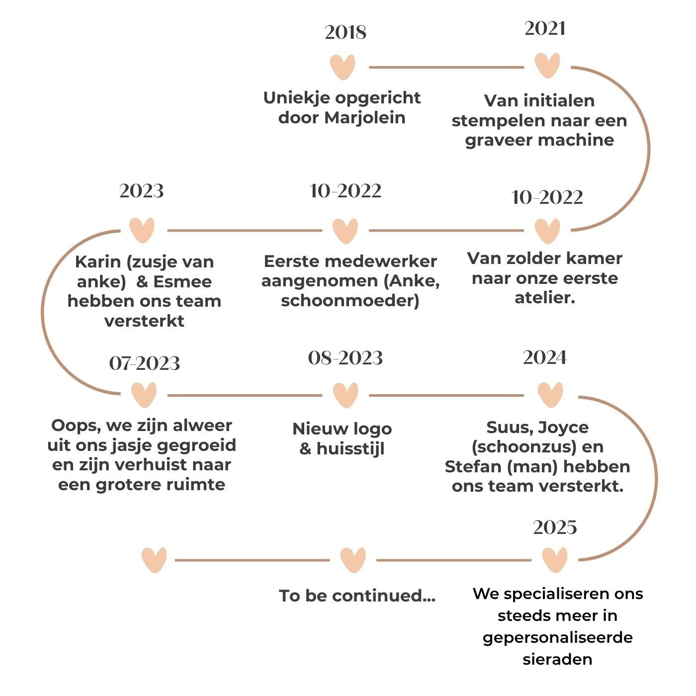 Het waren zware jaren waarin ik enorm heb moeten vechten, maar ook leerde om beter naar mijn lichaam te luisteren. Om in die periode rust te vinden, begon ik met het maken van sieraden. Wat startte als ontspanning, groeide uit tot een grote passie. Op mijn zolderkamer begon ik met het maken van mijn eerste gepersonaliseerde sieraden met initialen en namen.