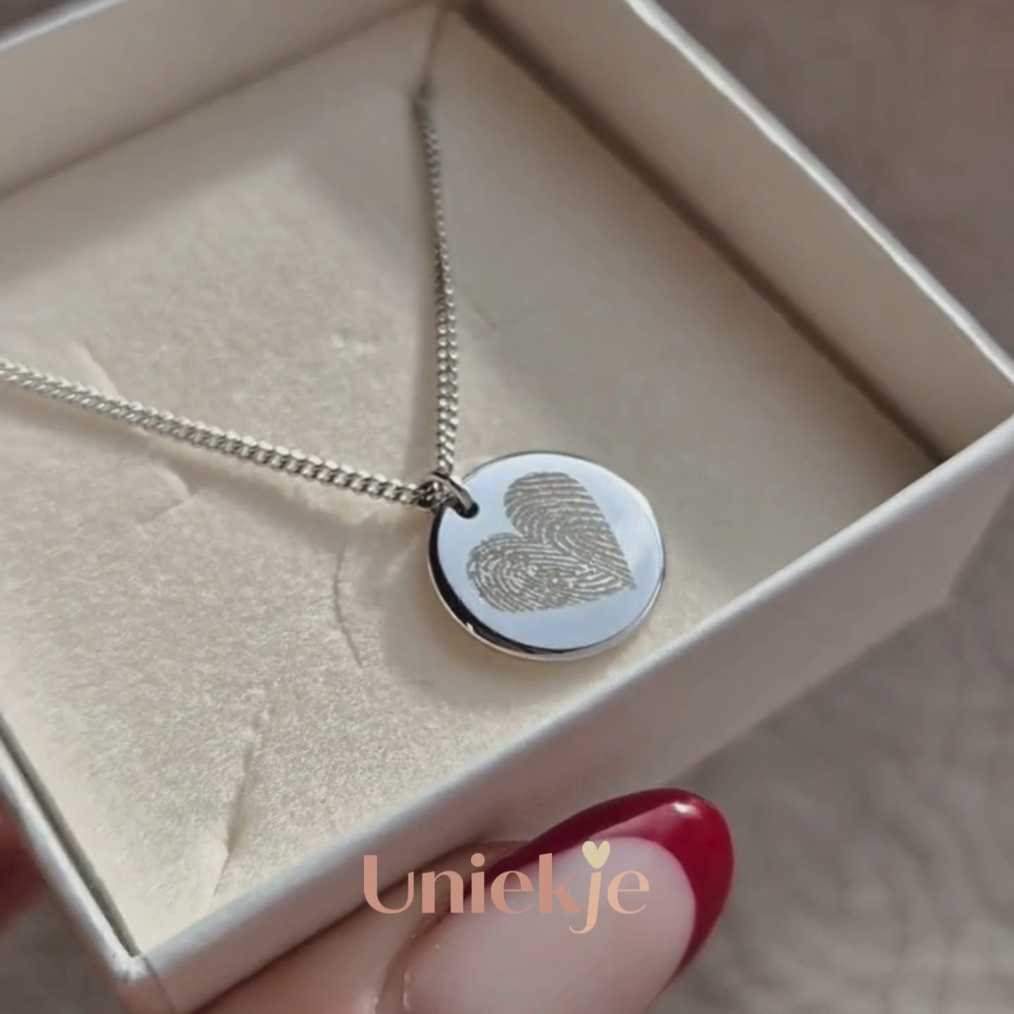 Personaliseer deze ketting met 2 vingerafdrukken. Wij combineren vervolgens beide afdrukken met het meest unieke deel en vormen er een hartje van. Zo kan jij de vingerafdrukken van 2 dierbare personen dicht bij je dragen zoals papa en mama of opa en oma. Om je vingerafdruk sieraad nog persoonlijker te maken kan je de achterkant laten graveren met bijvoorbeeld namen of een eigen tekst naar keuze.